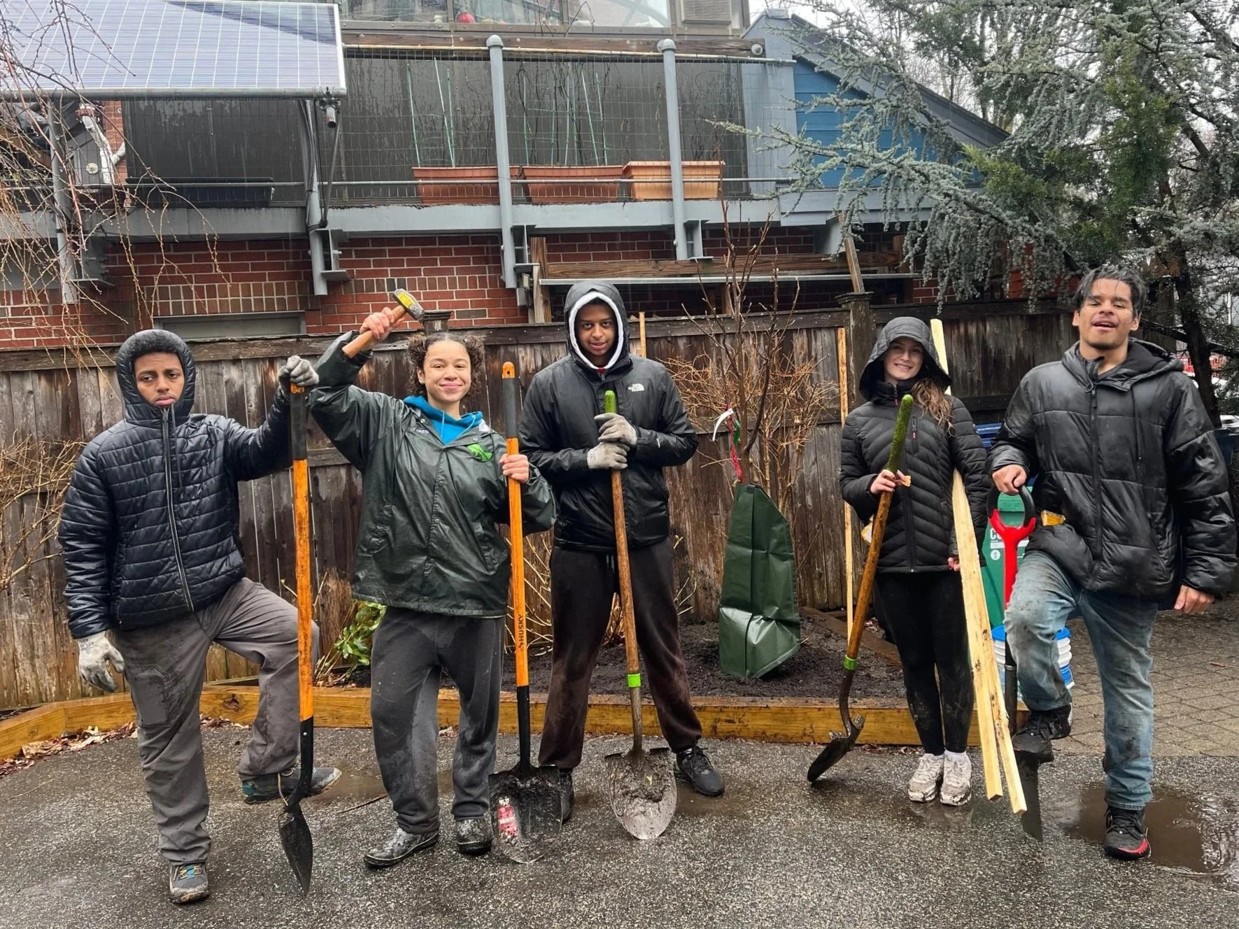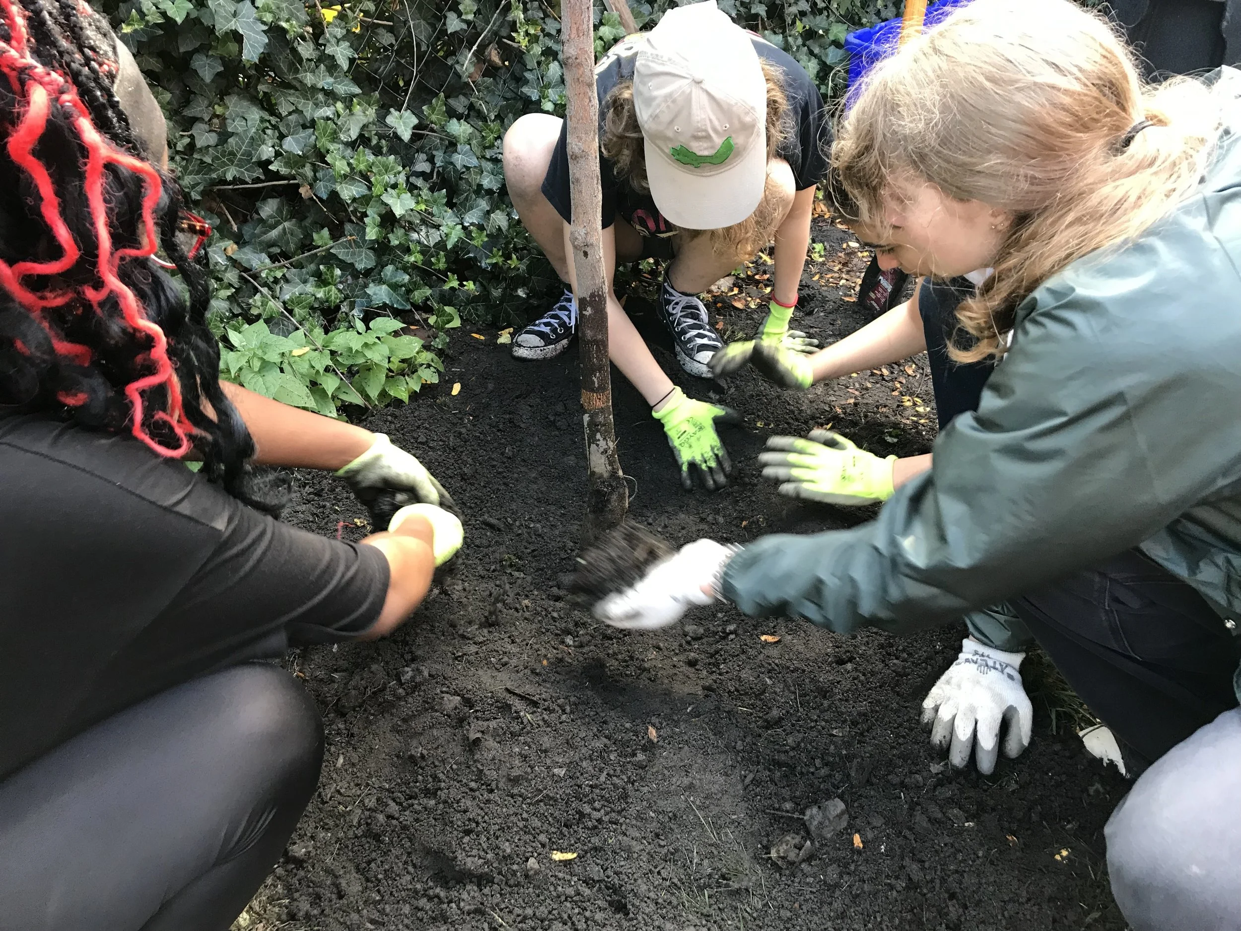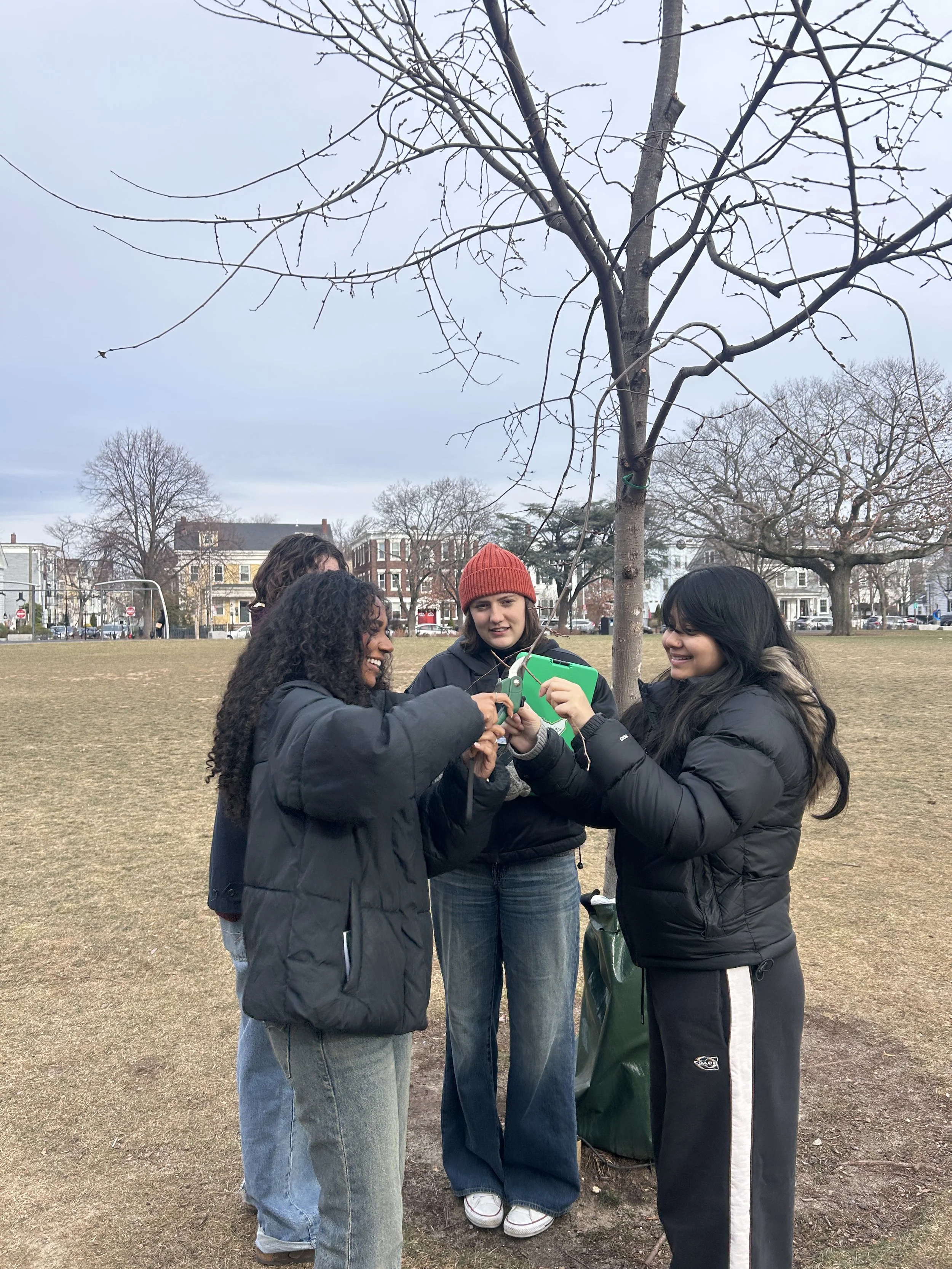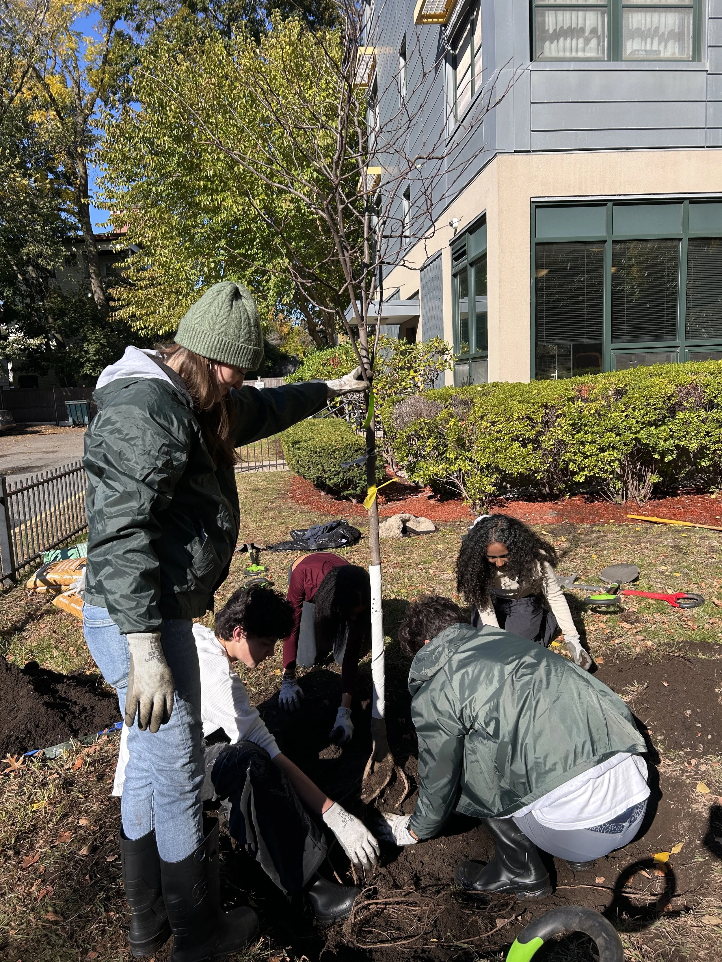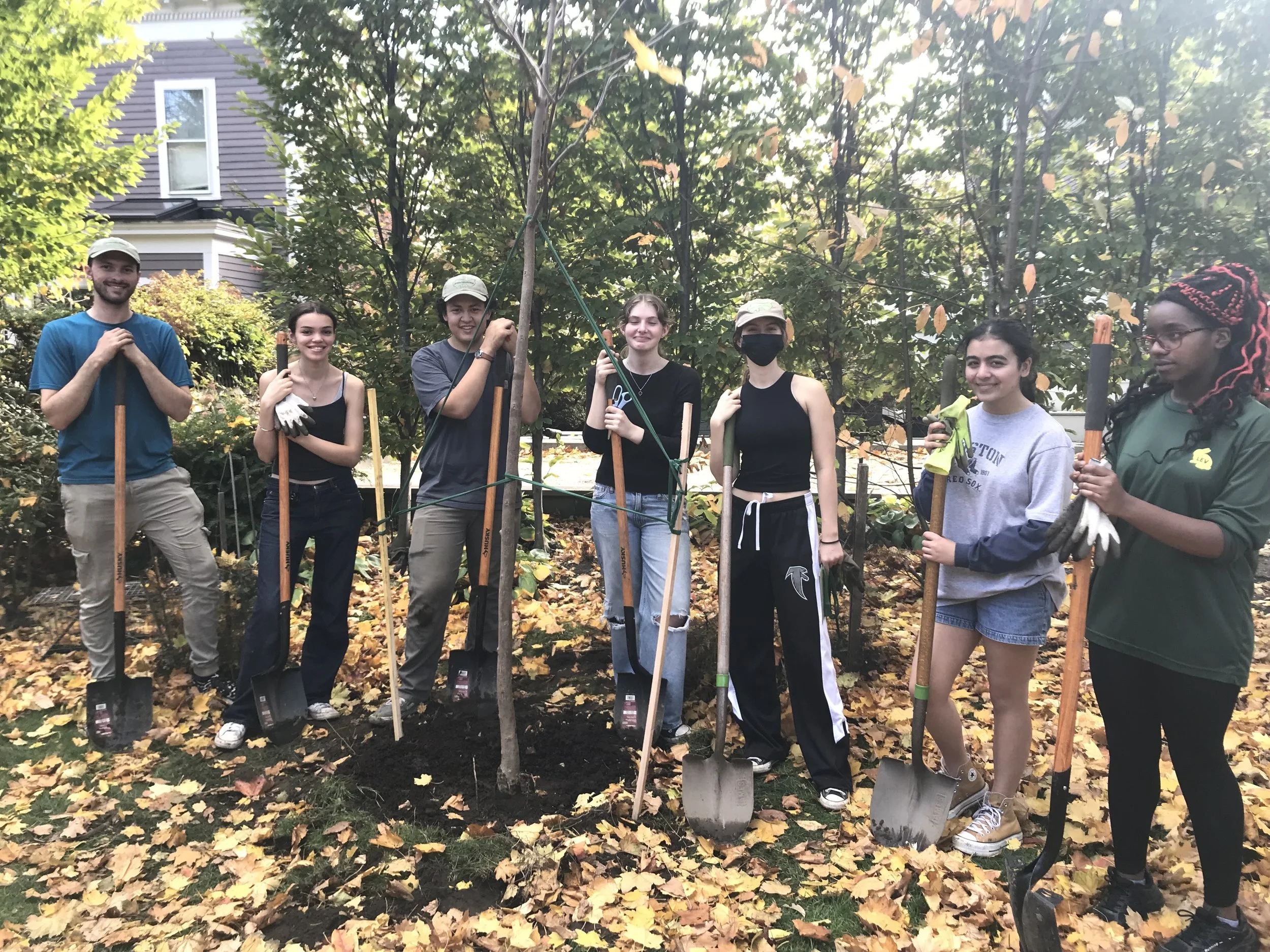 From October-May, our cohort of 10-12 teens plant trees on private property across Cambridge, helping to build and grow our urban forest while exploring green careers, learning about environmental science, justice, art, and policy, and developing a deeper connection to nature and a sense of agency in the fight against climate change. Crew members practice and conduct community outreach, and in the spring, deliver a youth-led capstone project focused on community education, conveying the importance of trees and the role they play in creating a sustainable city.