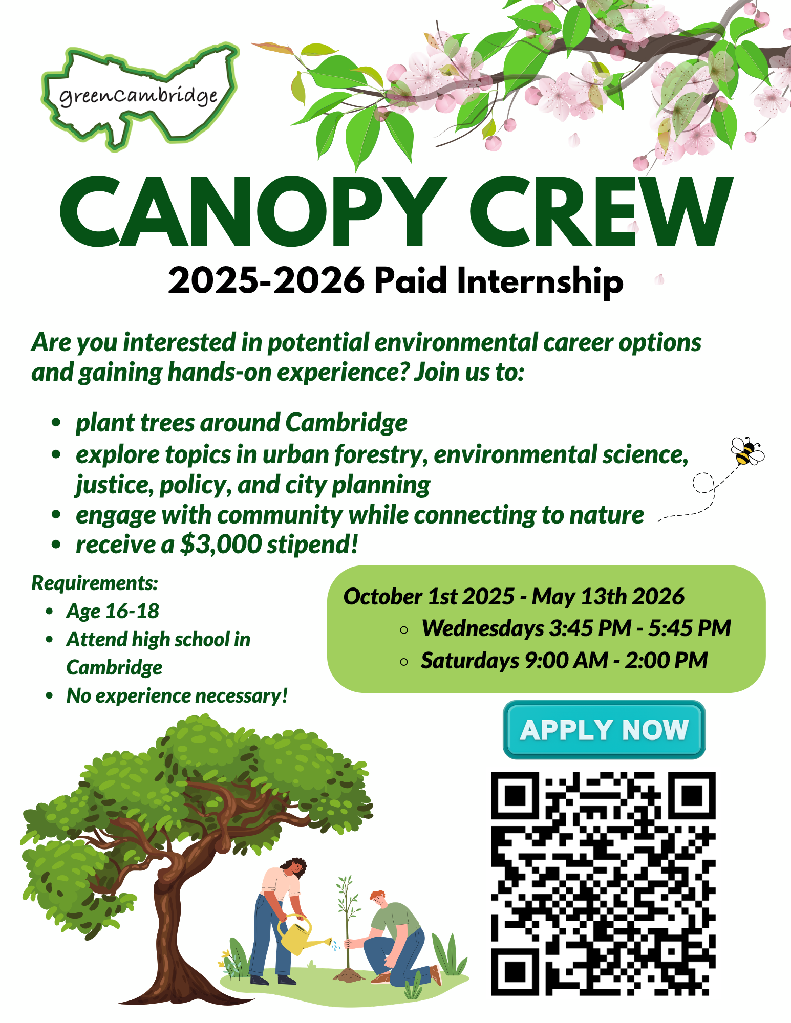 A paid 8-month urban forestry and environmental careers discovery program for Cambridge high school students aged 16-18.