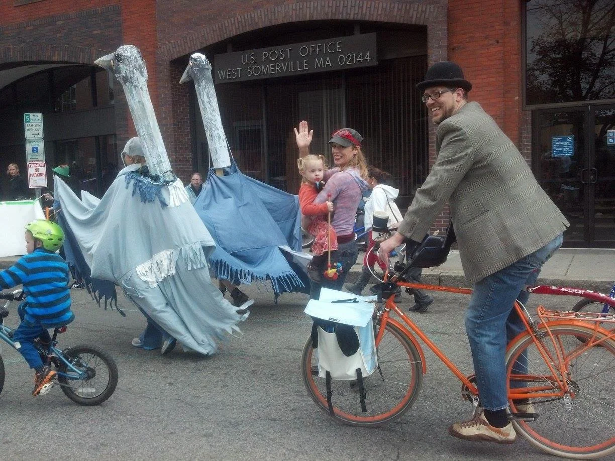 Our giant puppets and animal costumes of local wildlife are part of the annual Honk! parade between Davis, Square, Somerville and Harvard Square, Cambridge.